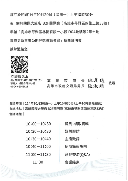 高雄市交通局舉辦「高雄市苓雅區林德官段一小段1904地號都市更新事業公開評選實施者案」-招商說明會